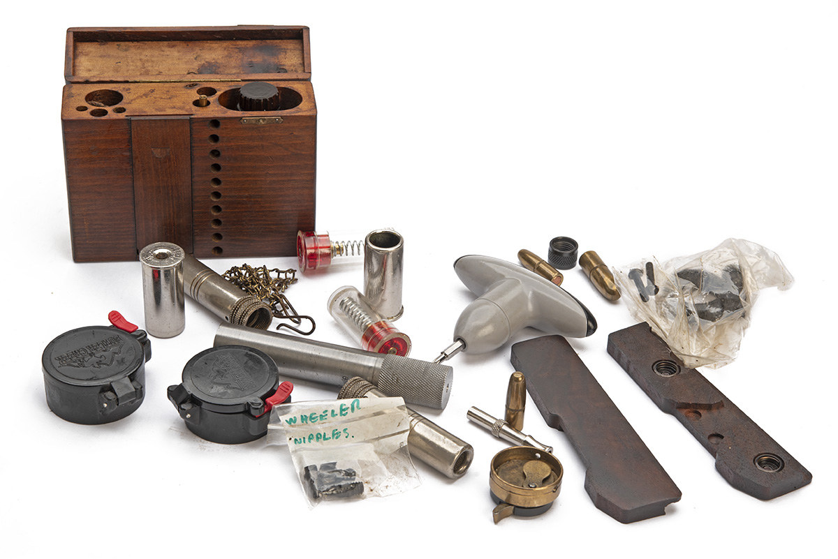 A GROUP OF SHOOTING RELATED ITEMS, vintage cleaning kit in wooden box, 12-bore snap caps, bullet dummies, powder flask replacement top & chain, screwdriver, cleaning tools & other sundries