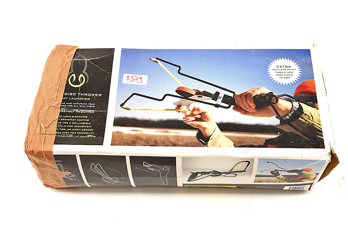 A 'HYPER DISC THROWER' CLAY LAUNCHER IN ORIGINAL BOX includes three replacement bands