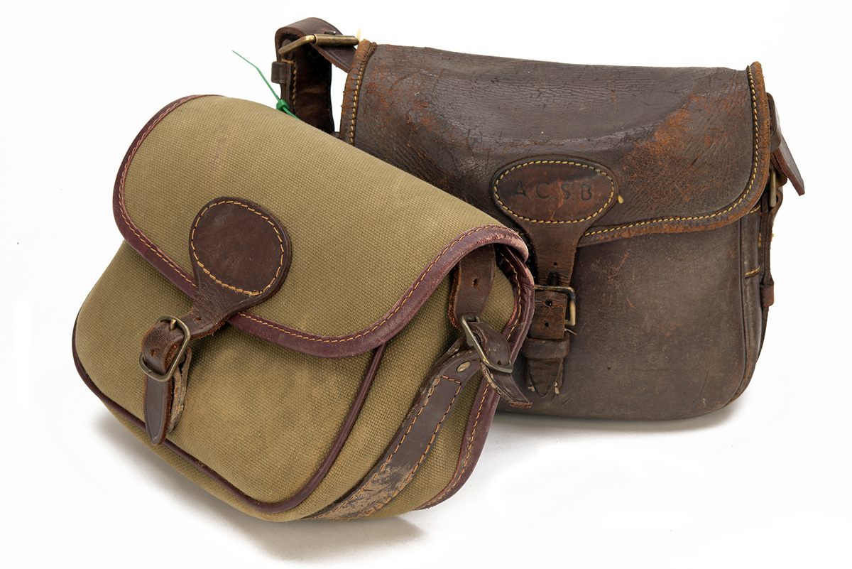 TWO VINTAGE CANVAS & LEATHER CARTRIDGE BAGS, green canvas and brown leather, brass fittings with canvas strap