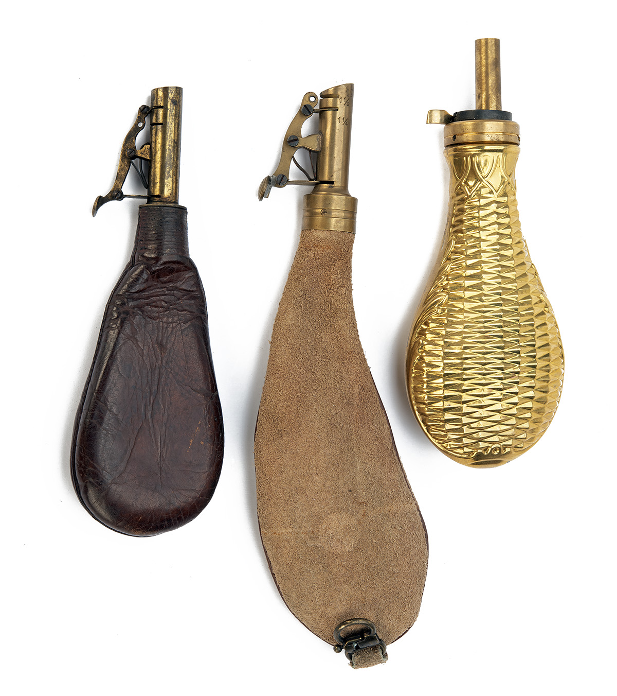 THREE POWDER & SHOT FLASKS, one adjustable 1 1/2, 1 1/4 brass top , leather shot flask