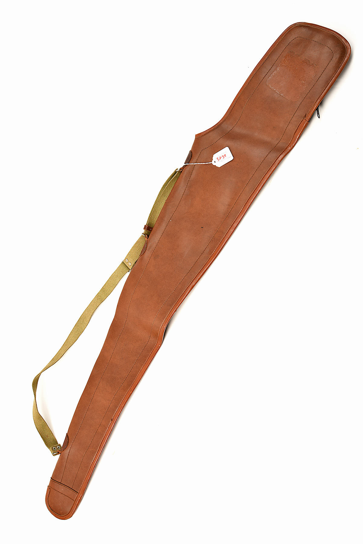 A BROWN LEATHER SINGLE GUN SLIP WITH CANVAS SHOULDER STRAP