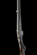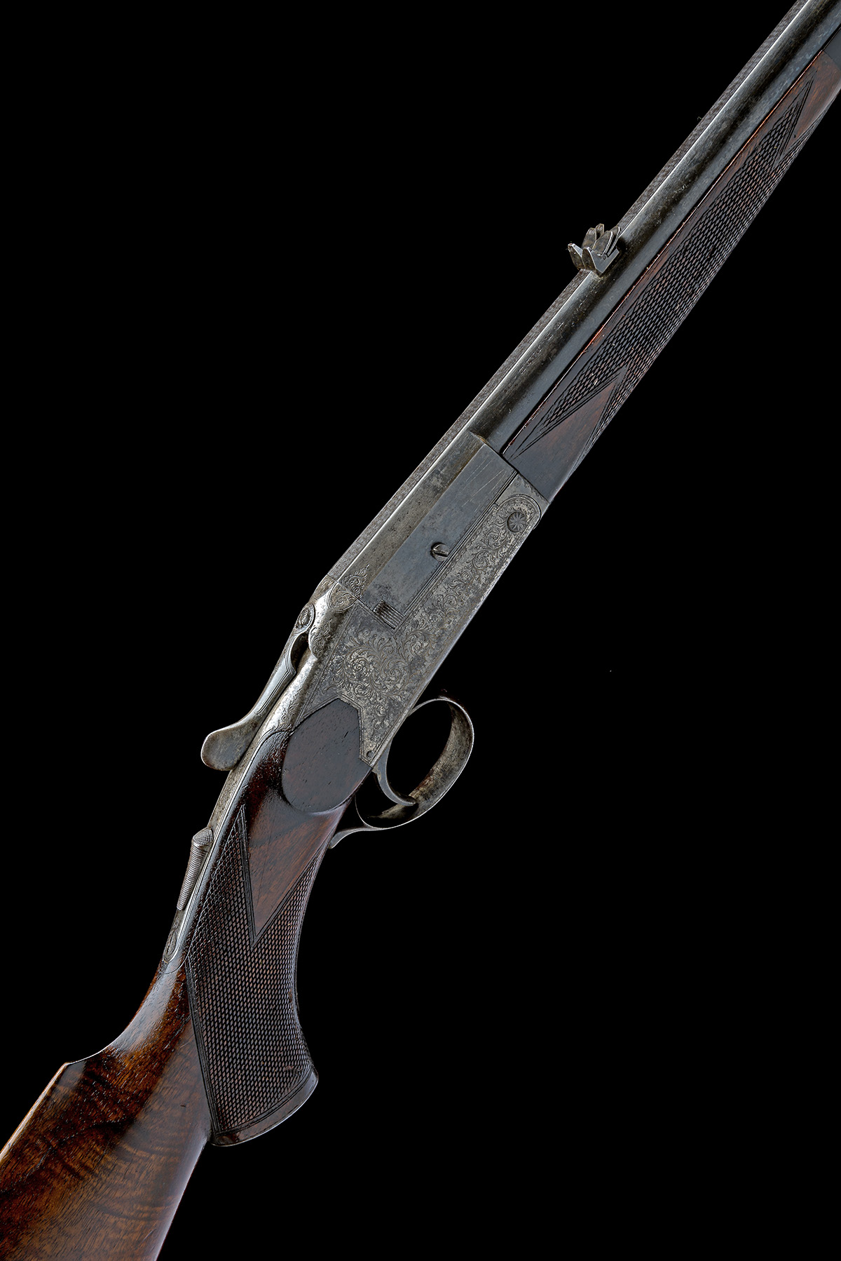 for 1902, with reblued ovoid 26in. barrel, machine-engraved sighting flat with dove-tailed fore-sight and standing notch rear-sight with two additional folding leaves, border and scroll engraved breech-end, automatic ejection on opening, border and scroll engraved boxlock hammerless action with toplever opening, top-tang safety, walnut butt-stock with chequered and capped pistol-grip, truncated cone head, ribbed heel, guarded trigger and chequered walnut splinter snap-on fore-end with horn tip