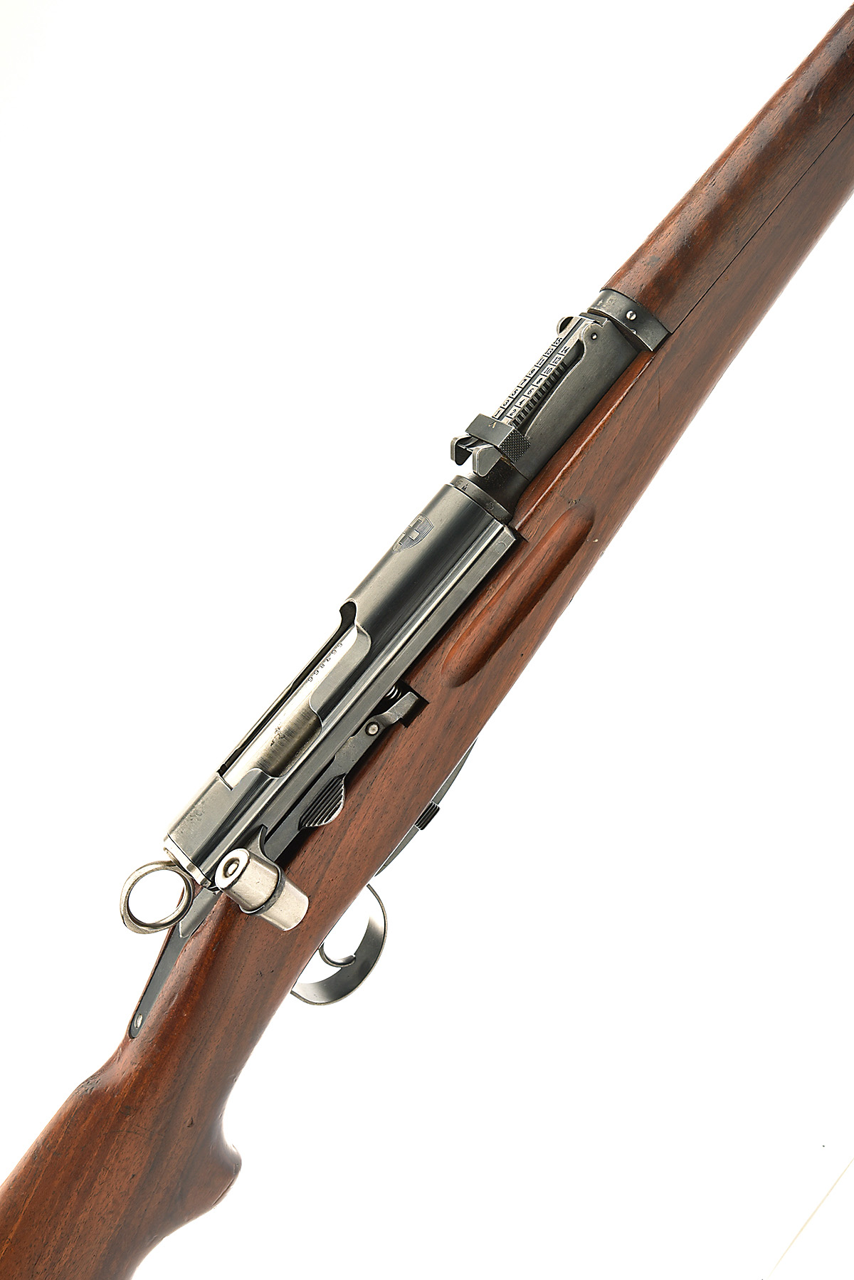A SWISS 7.5X55mm 'SCHMIDT RUBIN MODEL K31' STRAIGHT-PULL SERVICE RIFLE, serial no. 563866, circa 1945, 25 1/2in. nitro barrel, protected block-mounted fore-sight, tangent rear-sight, ring pull safety, detachable magazine, full-length stock, steel butt-plate