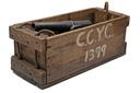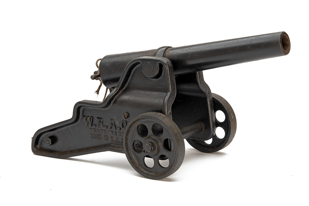 circa 1930, with signed tapering iron 12in. barrel signed and marked 'NOT FOR BALL', flip-open breech with locking handle, cast iron trolley with 'W.R.A.Co.' together with 'TRADE MARK REGISTERED IN U.S.A.' in raised letters and six-hole cast iron wheels, black finish with some light shallow pitting, in its open top wooden transit chest marked 'BREECH LOADING CANNON' and painted 'C.C.Y.C.'