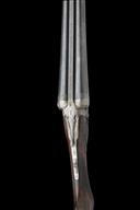 circa 1905, 30in. nitro reproved barrels, file cut rib with banner engraved 'C.G. BONEHILL MAKER BIRMINGHAM.', the breech ends engraved with bands of wheat, 2 1/2in. chambers, bored approx. true cyl. and full choke, scoop-back treble-grip action with removable striker discs, carved serpentine fences, automatic safety with gold-inlaid 'SAFE' detail, bold acanthus scroll engraving with central floral bouquets, 14 1/4in. figured semi-pistolgrip stock, pistolgrip fluted at the rear, ornate chequered recessed side panels, horn drop points, engraved steel heel and toe plates, bolstered fore-end wood, weight 6lb. 11oz., in a canvas case