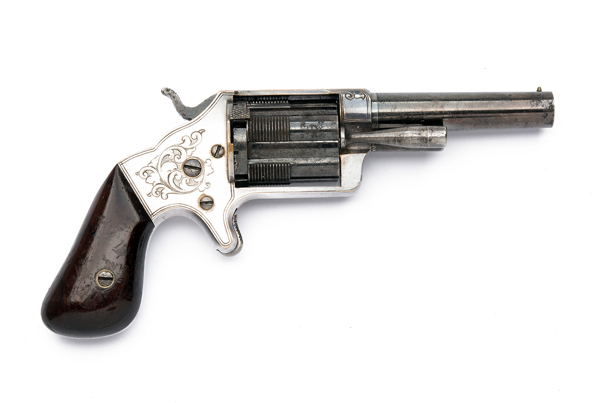 circa 1863, with 3in. round blued barrel, the top stamped 'B. A. CO PATENT APRIL 14TH 1863', bead fore-sight, shallow narrow sighting groove to the top-strap, foliate engraved silver-plated brass frame with sheath trigger and two piece smooth rosewood grips, five shot cylinder of a unique design with individual chambers in the form of sliding tubes with cutouts in the cylinder, the tubes sliding forward one at a time over a fixed rod on the right-side to expose, load and eject, complete with a period belt-holster