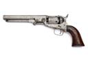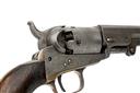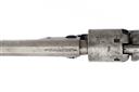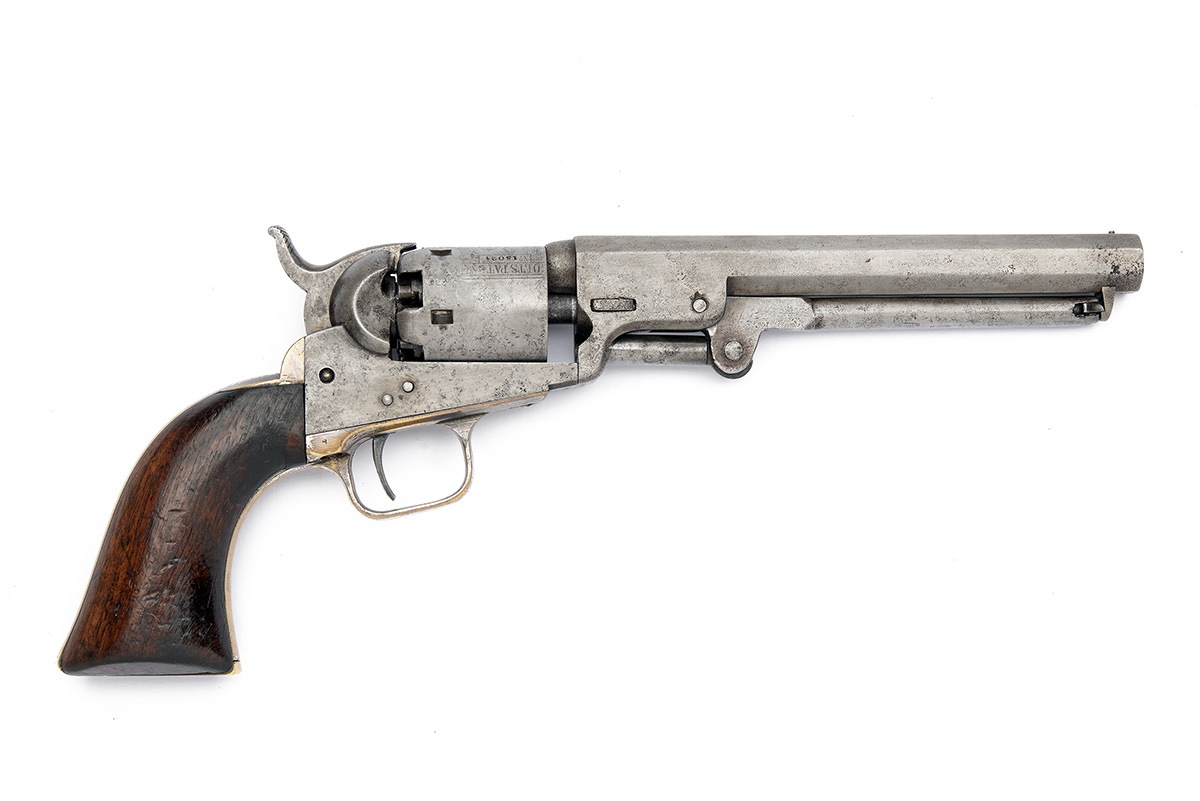 for 1850, with octagonal 6in. barrel signed on the top-flat in two lines, open iron frame marked 'COLTS PATENT, plain five-shot cylinder scrubbed of scene, brass grip-straps with traces of silver plating and smooth walnut one-piece grip, all matching numbers including wedge, cleaned of finish with mild pin-prick pitting