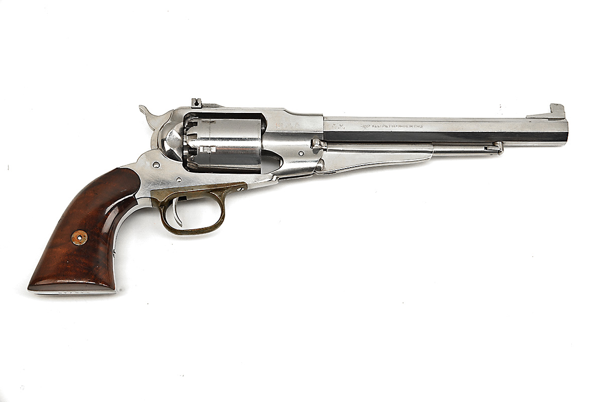 A REPRODUCTION PIETTA .44 PERCUSSION REMINGTON STAINLESS TARGET REVOLVER, serial no. 246745, with octagonal 8in. barrel, adjustable sights, plain cylinder, solid frame and smooth walnut grips