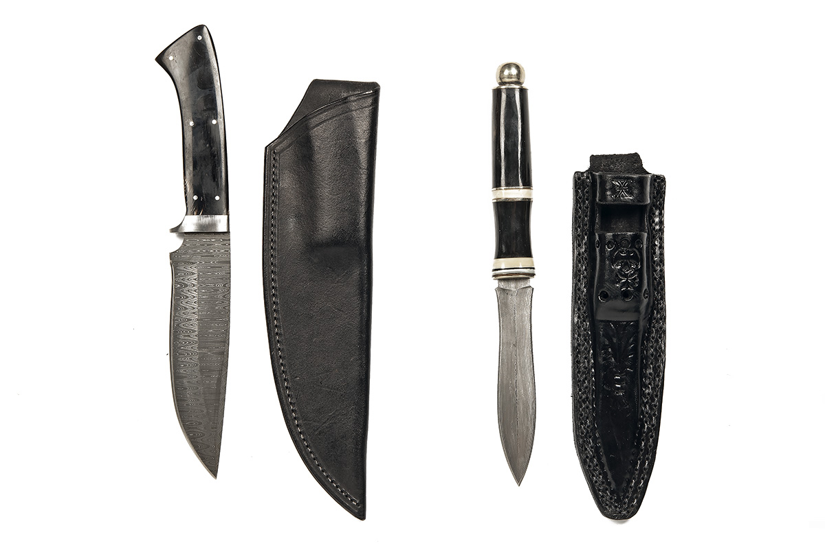 A PAIR OF BETTER DAMASCUS BLADED HUNTING KNIVES, being 1) a 5 1/2 in. single-edged Stamascus Knife Works Damascus Hunter with micarta sides with a heavy duty black leather scabbard with belt loop, 10 in. overall; 2) an unnamed double-edged Damascus Gladius blade of 4 3/4 in, with micarta handle, 9 1/2 in. overall
