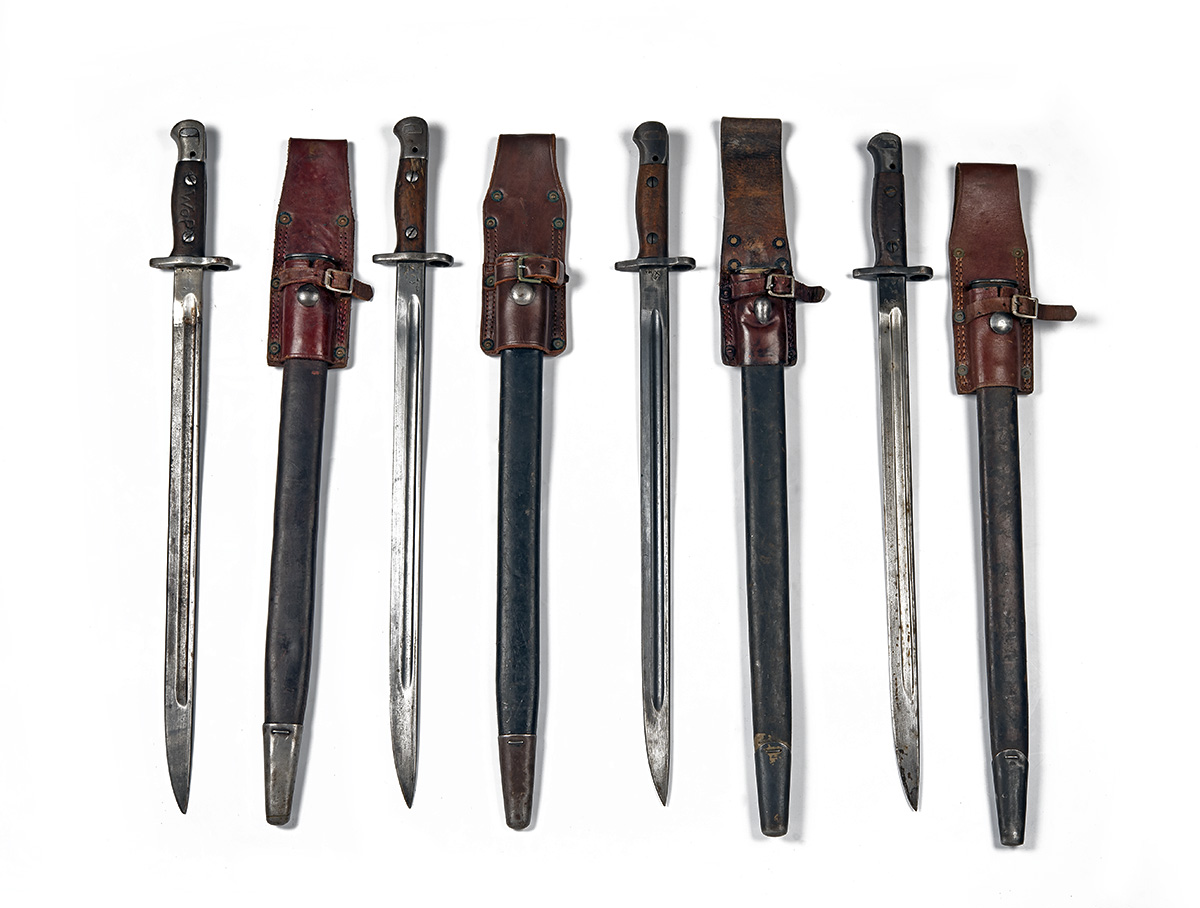 A GROUP OF FOUR PATTERN 1907 SWORD BAYONETS, each with 17 in. single-edged blades fullered on each side, wooden grips, black leather scabbards with steel fittings and brown leather frogs, 22 1/2 in. overall being 1) marked 'MA with issue date of '4. 42'. quillion removed, tear-drop frog stud, traces of khaki paint on scabbard; 2) by Sanderson with issue date of '11. 17'. quillion removed, round frog stud; 3) by Sanderson with issue date of '2. 17'. round frog stud, ricasso markings rubbed, Grip engraved 'WoP': 4) by Wilkinson, issue date '2 17' busy ricasso with many reissue marks, round frog stud