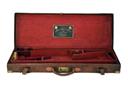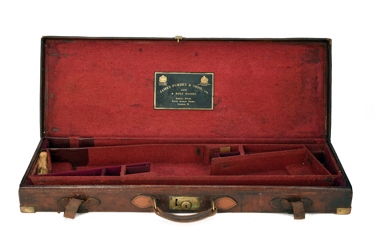 fitted for 30in. barrels, the interior lined with red baize, a leather gold-tooled James Purdey & Sons trade labels, brass lock (key missing), some repairs to baize, the lid exterior with a replacement leather cut-out