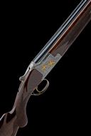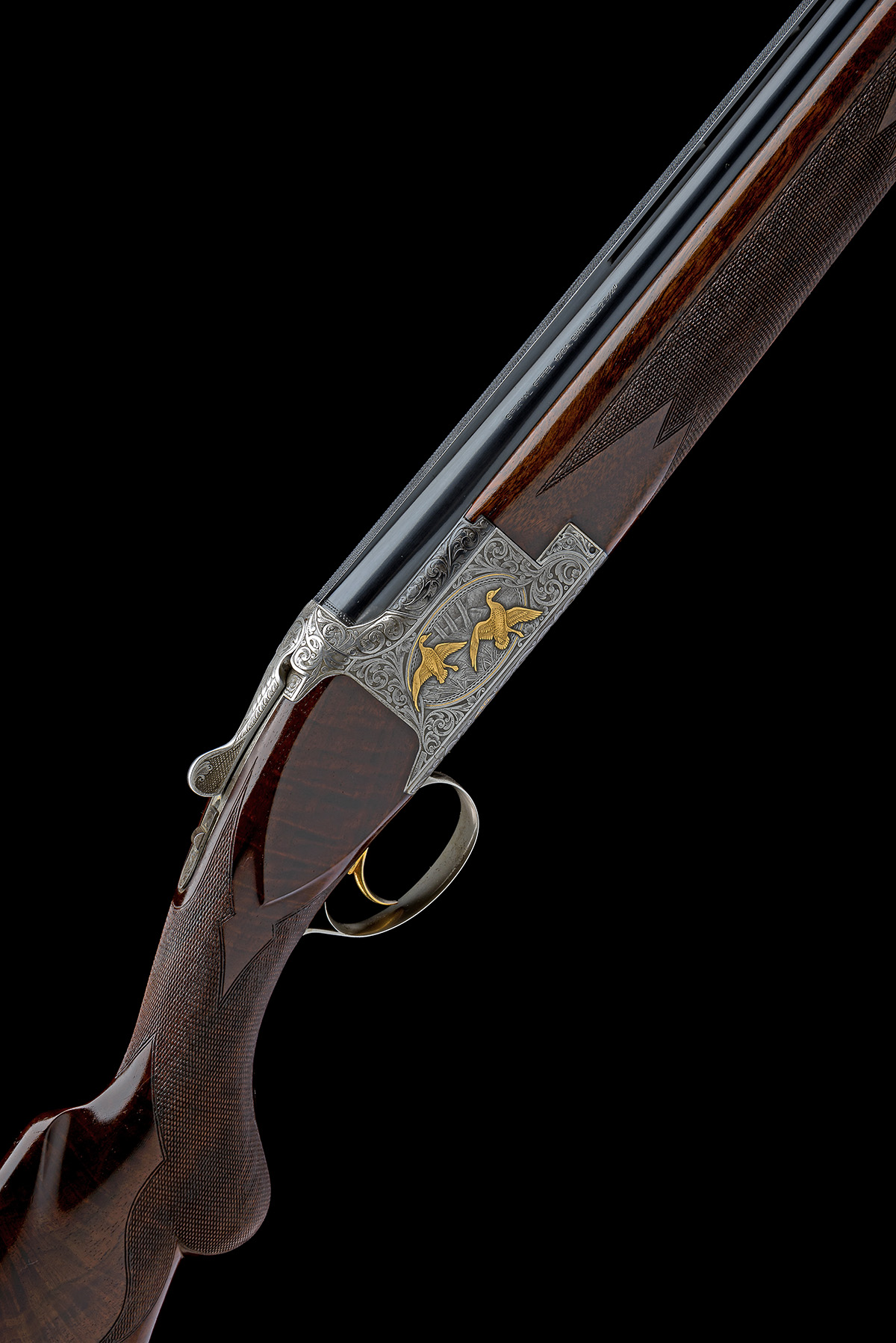 for 1982, 28in. nitro barrels with 8mm ventilated matt top-rib with intermediate bead sight, 2 3/4in. chambers, bored approx. 1/4 choke in both, hold-open toplever, manual safety with integral barrel selector switch with gold-inlaid 'O', 'U' and 'S' details, gold-washed trigger, the action and furniture carved in relief with bold scrolling acanthus on a matted background, surrounding gold-highlighted ovals with gold-inlaid scenes of American black duck in wetland landscapes, the underside with further gold-inlaid American black duck and a scrolling banner gold-inlaid '495 of 500', 14 1/4in. figured semi-pistolgrip stock with ornate bordering to the chequering, chequered butt, weight 7lb. 5oz., in a Browning case
