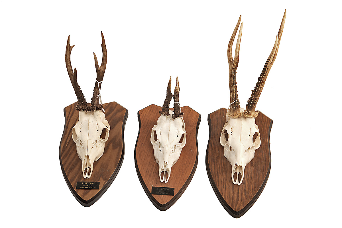 THREE SKULL-MOUNTS OF ROE DEER, approx. 6 points on wooden shield with plaque 'J. BENSON GOSFIELD 22ND APRIL 2009', approx. 3 points on wooden shield with plaque 'J. BENSON GOSFIELD 25TH APRIL 2009', approx. 4 points on wooden shield (3)