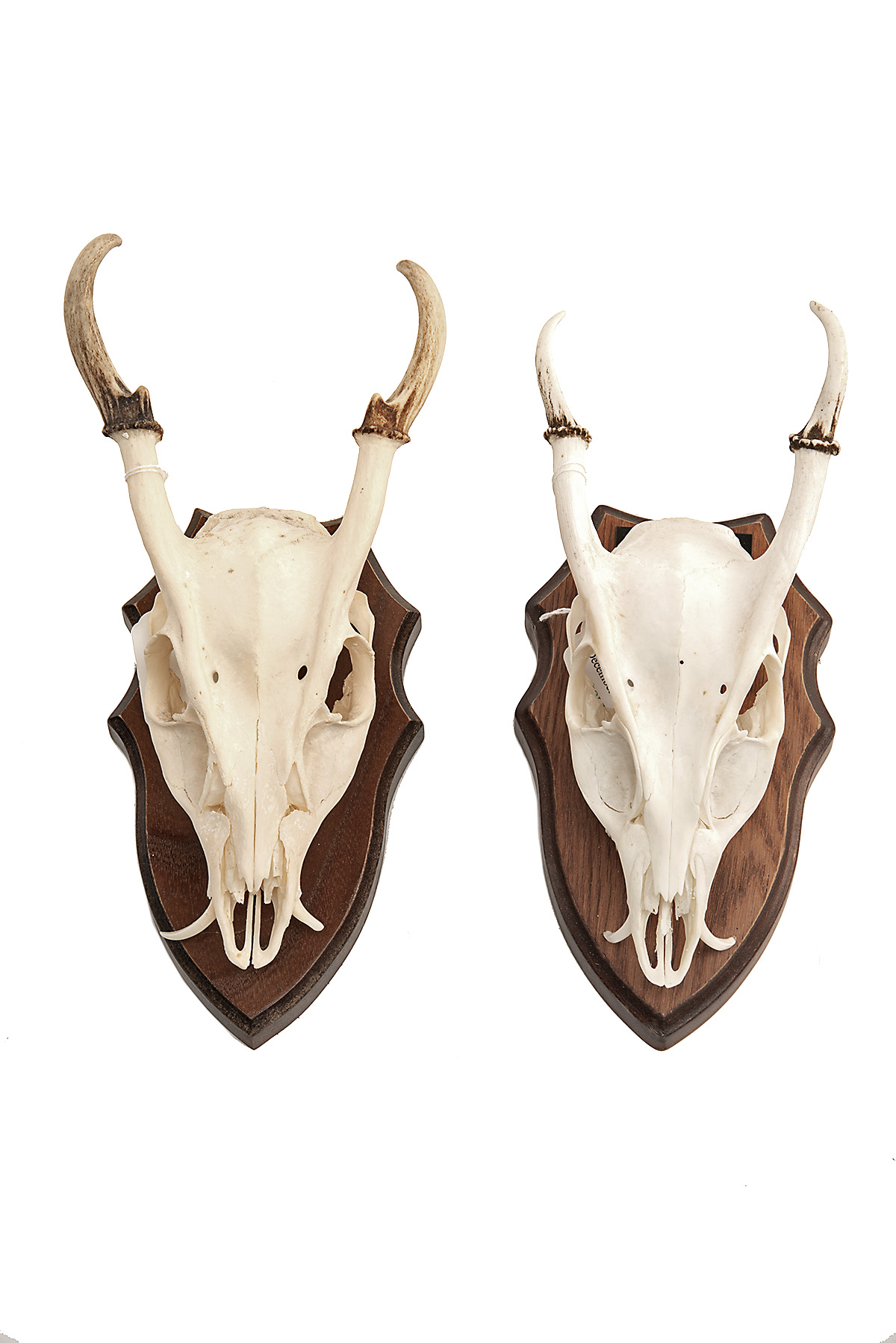 TWO SKULL-MOUNTS OF 'MUNTJAC', 1x mounted on wooden shield with plaque 'J. BENSON TABORS FARM 30TH APRIL 2009' 1 x mounted on wooden shield (2)