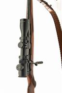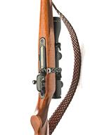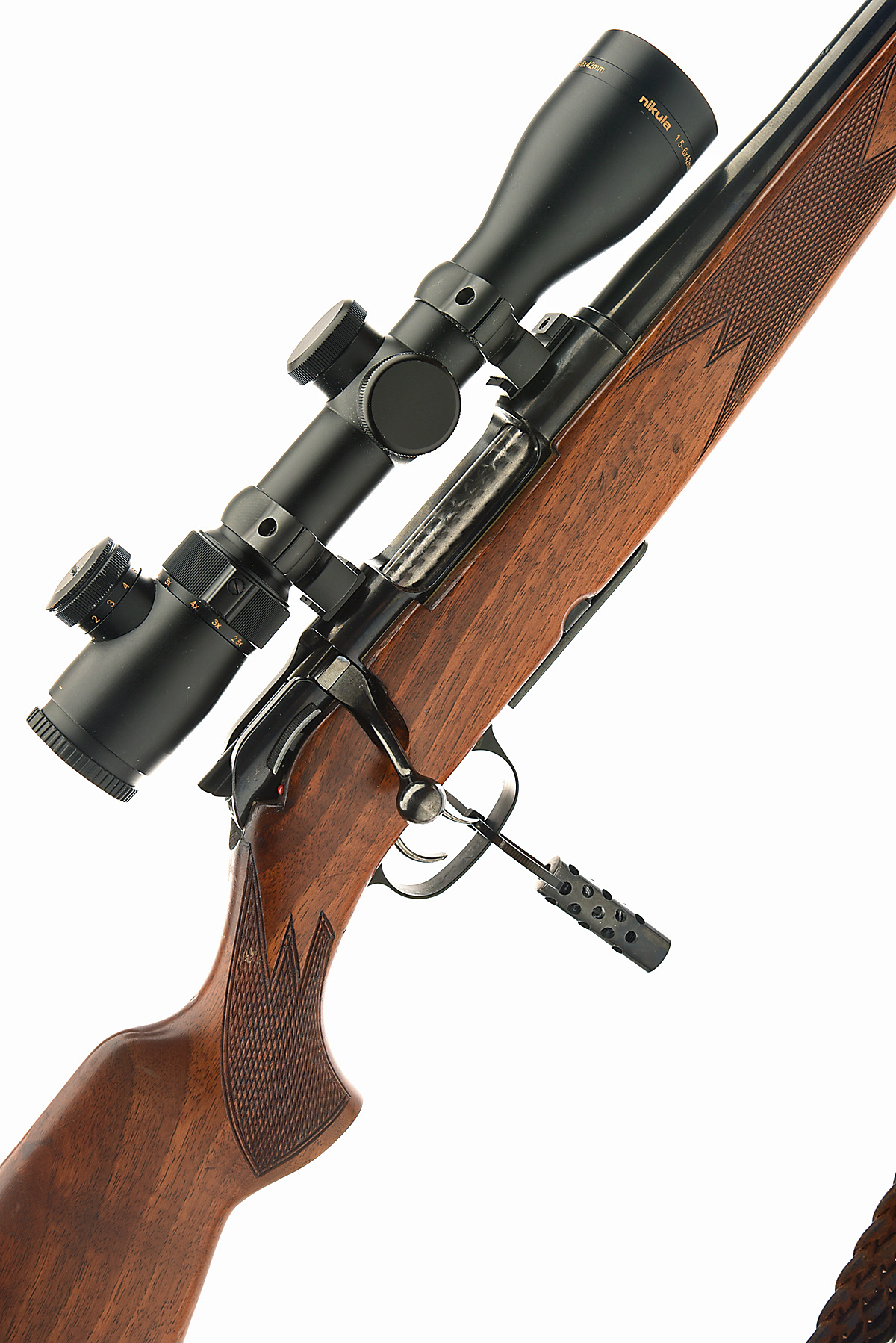 KRIEGESKORTE .243 BOLT-MAGAZINE SPORTING RIFLE, serial no. 138948, dated 1990, 22 1/2in. unsighted nitro barrel, threaded for sound moderator, fitted with a Nikula 1,5-6x42mm telescopic sight, manual safety, set triggers, detachable magazine, pistolgrip stock with recoil pad and cheekpiece, leather sling, muzzle break (detached)