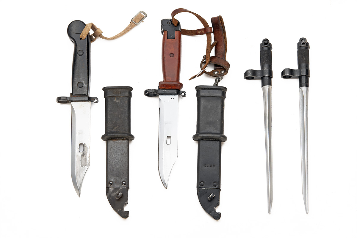 TWO KNIFE BAYONETS FOR THE AKM ASSAULT AND TWO SPIKE BAYONETS FOR THE CHINESE TYPE 63 SKS ASSAULT RIFLE, being 1) AKM Type 1 with 5 3/4 in. stainless steel clipped-point blade with saw-toothed spine, one-piece moulded plastic grip and pommel, steel scabbard body with lug and blade with window to create a wirecutter; 2) AKM Type 2 , as above but with squared-off steel pommel; 3&4) x2 SKS bayonets with 8 1/2 in. parkerised silver triangular/round blades with three deep fullers, chequered steel locking sleeve with muzzle-ring, spring and cross screw