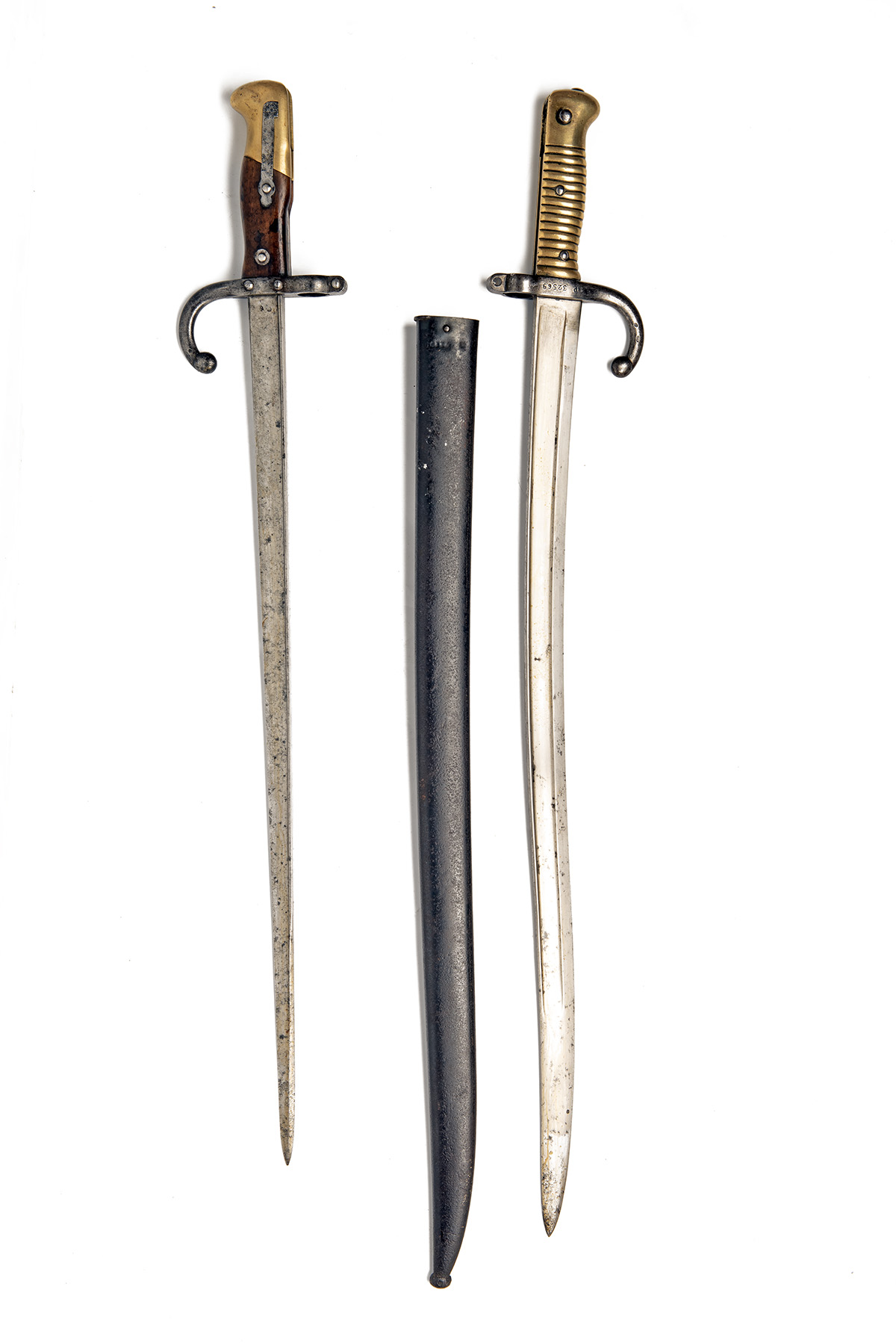 A FRENCH MODEL 1866 BAYONET FOR THE CHASSEPOT RIFLE AND A MODEL 1874 BAYONET FOR THE GRAS RIFLE, 1) dated 1872, with 22 1/2 in. single-edged yataghan blade fullered on each side, back engraved for St. Etienne arsenal, ricasso with inspection marks, steel quillioned cross-guard with inspection marks and stamped 'P 32569', brass hilt, steel scabbard stamped '71199', blade with some staining, scabbard with smoot pitting; 2) dated 1879, with 20 1/2 in. single-edged blade with inspection marks on forte, steel cross-guard with inspection marks and stamped 'F H 27800', wooden grips, brass pommel, blade with some blinded pitting and staining