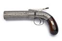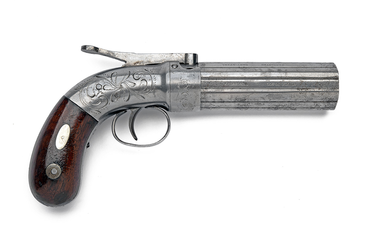 circa 1850, with ribbed 4in. six-shot barrel cluster, one rib signed 'STOCKING & CO, WORCESTER' and another 'WARRANTED CAST STEEL', integral nipples, scroll engraved nipple-shield, straight centrally-mounted long bar hammer marked 'PATENT SECURED 1848', scroll engraved rounded action with guarded trigger and smooth walnut bag-shaped grips with white-metal oval escutcheons to each side, cleaned of finish
