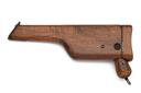 circa 1915, with round tapering 5 1/2in. barrel, integral receiver with internal bolt and rear-cocking piece, small ring hammer and new-style safe, frame with integral box magazine and milled sides, 33 groove walnut bag-shaped grips, older refinish now faded and with its matching number walnut holster-stock (splits and repairs to long length)
