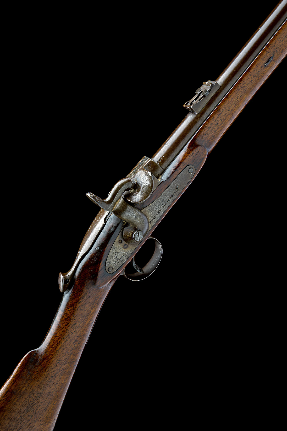 dated 1874, with 25in. Birmingham proofed barrel, engraved 'WHITWORTH PATENT' at breech, block and blade front-sight and reversed carbine pattern rear-sight graduated to 400 yards, the breech lever engraved 'WESTLEY RICHARDS PATENT' together with the triangle trademark, the lock stamped on the tail with a similar trademark dated 1884 and 'WESTLEY RICHARDS & CO' to the bar, iron mounted walnut full-stock, complete with sling swivels and iron clearing rod