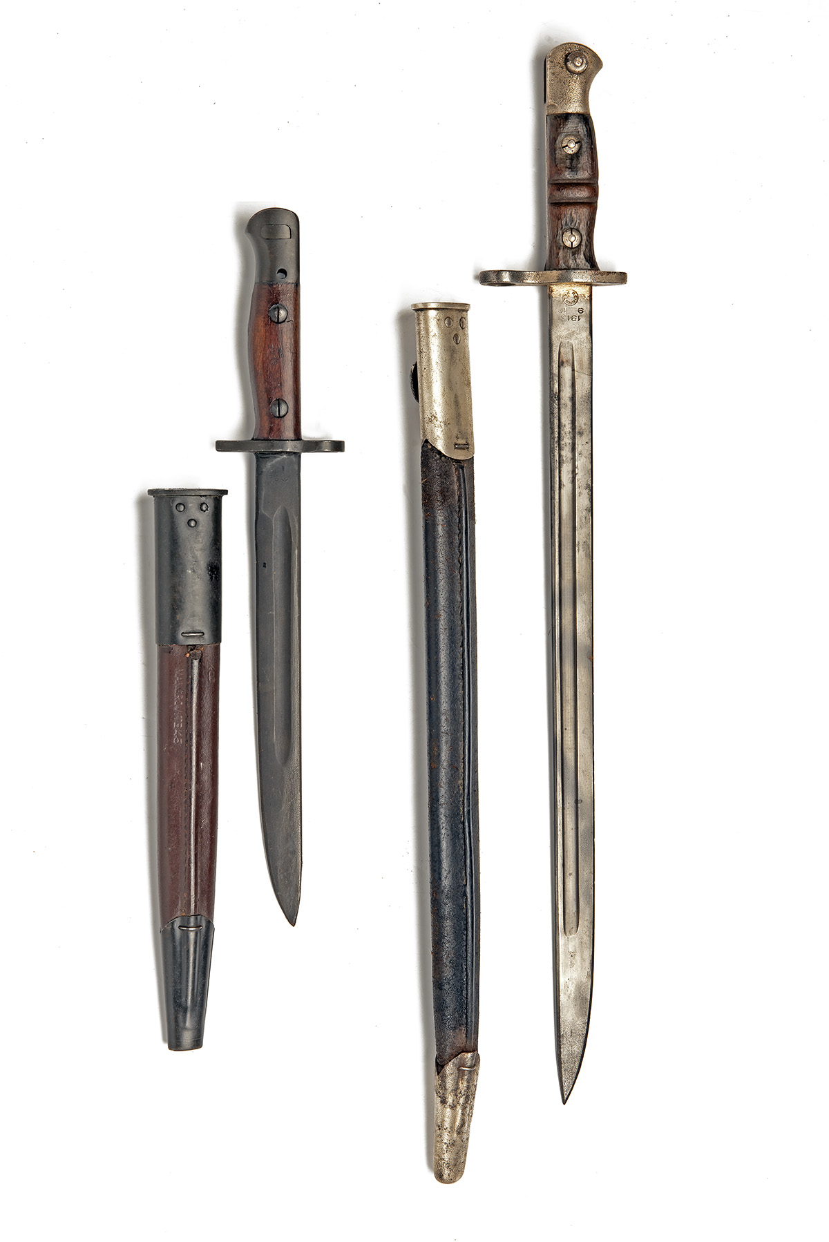 AN AUSTRALIAN OWEN PATTERN KNIFE BAYONET AND A PATTERN 1913 SWORD BAYONET, mid-20th Century, 10 in. single-edged blade fullered on each side, ricasso marked 'X MA / 53' with Broad Arrow and '52' over, wooden grips marked 'SLAZ 52' on one and 'SLAZ 53' on the other, brown leather scabbard stamped 'MANGROVITE 45', steel fittings, light wear, possibly unissued; plus a Pattern 1913 bayonet by Remington issued '9 16', worn and pitted, heavily cleaned, release button frozen, scabbard fittings detached
