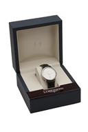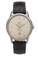 for 2018, with 21 jewel movement, cream coloured dial with gold baton markers, luminous gold sword hands with running seconds at '6', date window at '3', polished 38mm stainless round case with plain bezel not including the winder at '3', sapphire crystal and screw-down back, fitted to an alligator leather strap with Longines buckle, in its makers box with outer carton, instruction book and guarantee card