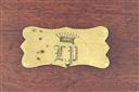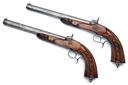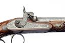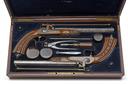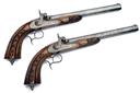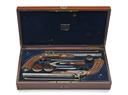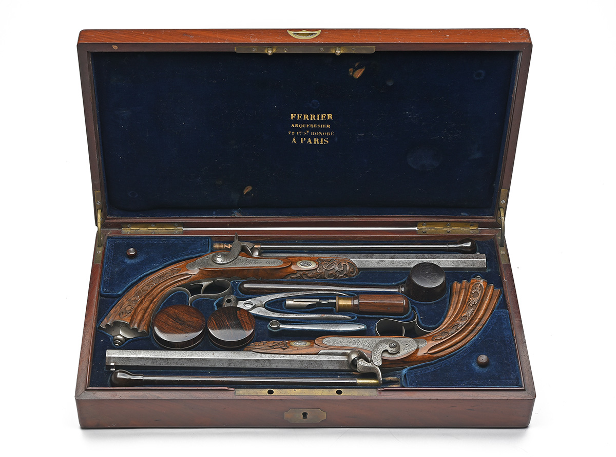 circa 1845, with Belgian proved octagonal 10in. rifled barrels, the top-flats signed 'F.P. FERRIER FB. ST. HONORE A PARIS', engraved breech-blocks 'in the white' marked '1' and '2' in gold respectively, moulded nipple-bosses, dove-tailed beaded fore-sights, standing notch rear-sights, border and scroll engraved hump-backed locks with dipped tails, en-suite hammers, walnut half-stocks relief-carved with raised floral scroll-work to the fluted grips and fore-end tips, engraved and moulded butt-caps with central spires, spurred trigger guard bows, white metal oval barrel-key escutcheons, complete with their original mahogany case lined and compartmented in the Continental manner in blue velvet, retaining the lidded corner compartments with turned wood handles and a full suite of original accessories including a teak loading mallet and handled tools, mould and loading rods, the exterior with central escutcheon to lid with monogram below a coronet (no key for lock)