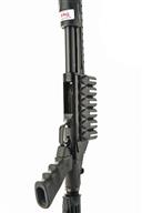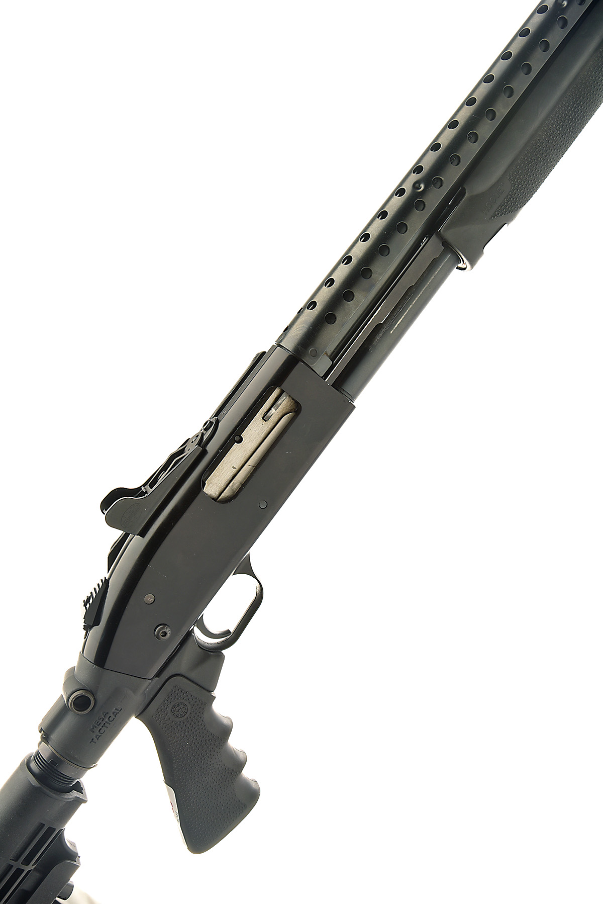 AN F.A.C.-RATED MOSSBERG 12-BORE (3IN.) 'MODEL 500A' PUMP-ACTION SHOTGUN, serial no. P635000, circa 1999, serial number under cartridge holder, 24in. ribless nitro slugster barrel fitted with heat shield, ramp-mounted blade fore-sight, 3in. chamber, bored approx. true cyl., receiver fitted with an adjustable peep sight to the top and Tacstar Industries Ltd. Side Saddle cartridge holder for six shells, oversized manual tang-mounted safety, adjustable Mesa Tactical synthetic pistolgrip stock with Hogue grips, Hogue fore-end, weight 7lb. 15oz. the whole in matt black finish
