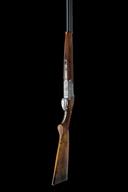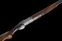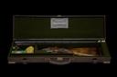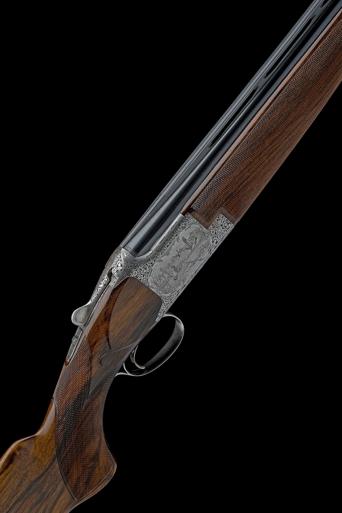 for 1972, 27 1/2in. nitro barrels with 12mm ventilated matt top-rib, 2 3/4in. chambers, bored approx. 1/4 and 3/4 choke, hold-open toplever, automatic safety with gold-inlaid 'O', 'U' and 'S' details, the top-tang gold-inlaid 'EX', the action and furniture finely carved in relief with stylised floral and ribbon motifs on a matted background, surrounding finely engraved vignettes of pointer and alighting duck and signed 'A.M. BROWN', the triggerguard engraved 'M.G.A.', 14 1/4in. well figured pistolgrip stock including 1/2in. ebonite extension and 1 1/8in. rubber recoil pad and ebonite extension, weight 7lb., in a brass-cornered pigskin case