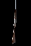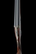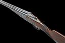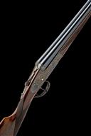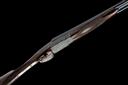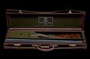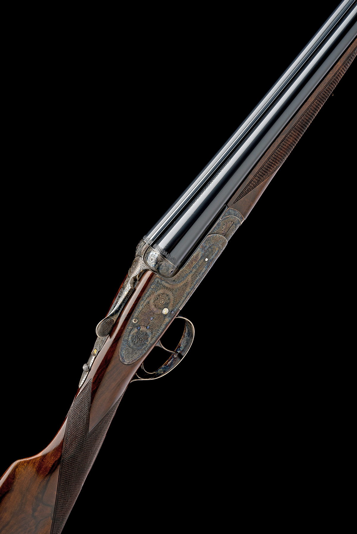 for 2019, 28in. high performance steel proof nitro chopperlump barrels, 2 3/4in. chambers, bored approx. imp. cyl. in both, round bodied action with removable striker discs, automatic safety with gold-inlaid 'SAFE' detail, Holland & Holland style self-opening system, gold-inlaid cocking-indicators, articulated front trigger set for the left, left-hand rolled-edge triggerguard, border and acanthus scroll engraving with floral bouquets, retaining much original colour-hardening and finish, 15in. figured stock (cast on for the left shoulder) including 1/2in. extension, weight 6lb. 2oz., in its makers lightweight burgundy leather guncase with canvas and leather outer