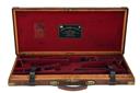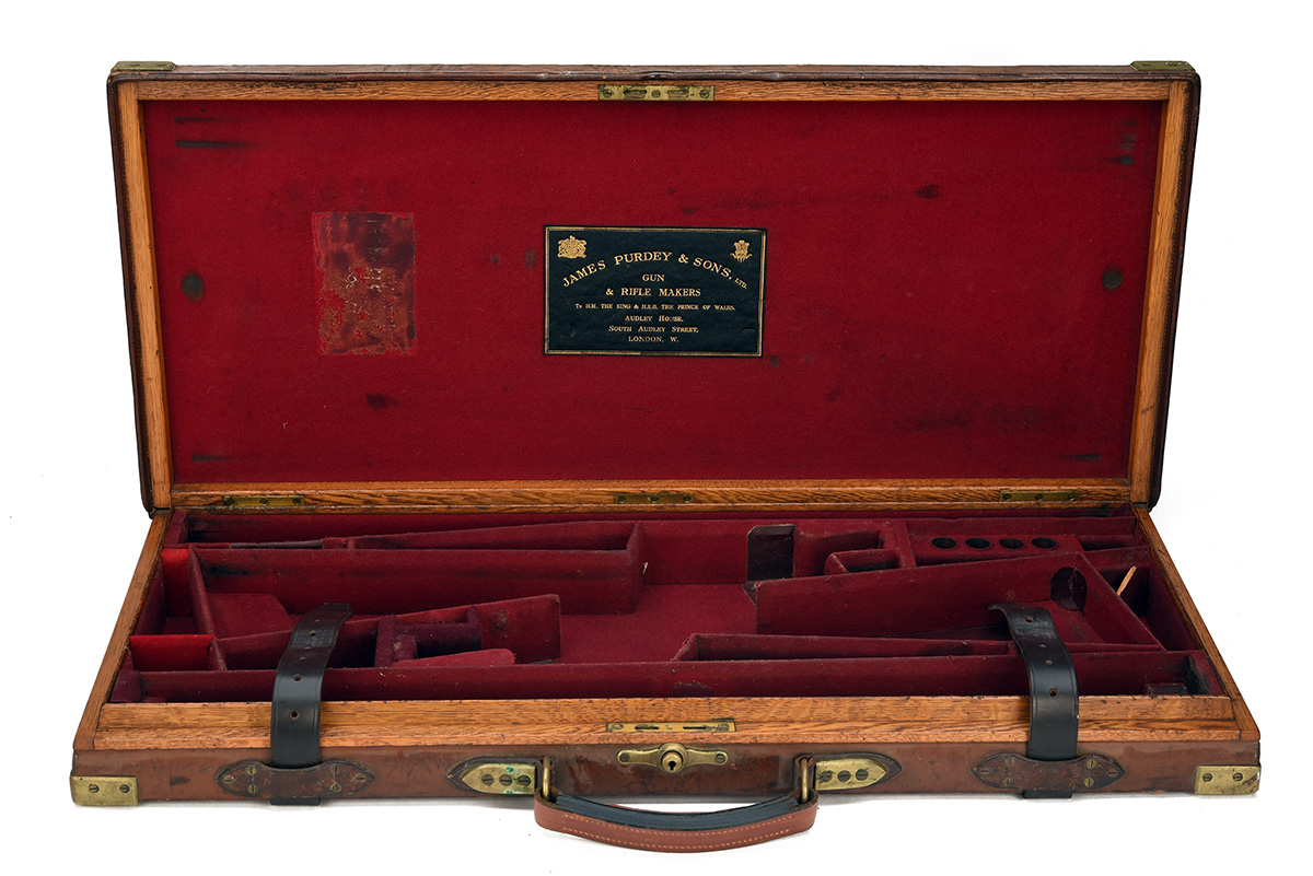fitted for 28in. barrels, the interior lined with red baize, a leather gold-tooled James Purdey & Son Ltd., trade label, central brass push-button lock (key missing), the lid exterior embossed with the initials 'J.B.T.' and with a central blank brass escutcheon