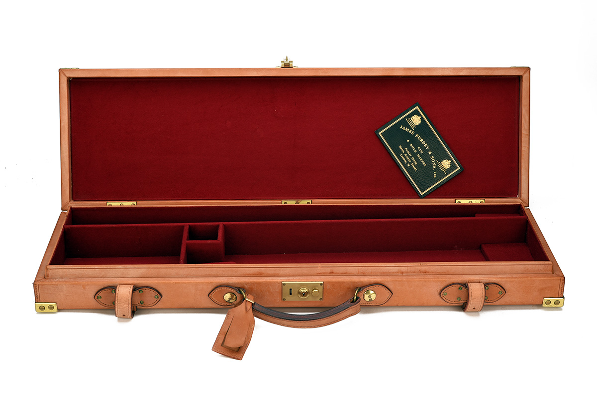 fitted for 30in. barrels, the interior lined with red baize, a leather gold-tooled James Purdey & Son Ltd trade label (detached), central brass push-button lock (including keys)