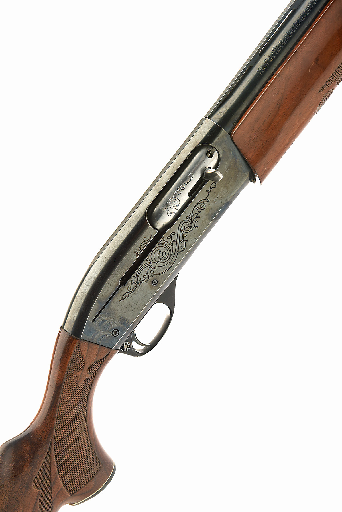AN F.A.C. REMINGTON 12-BORE 'MODEL 1100' SEMI-AUTO SHOTGUN, serial no. L588568V, circa 1972, 28in. nitro barrel with 8mm ventilated matt rib, 2 3/4in. chamber, bored approx. 1/2 choke, manual push-button safety, blacked action with acanthus scroll engraving, 13 3/4in. ornately chequered pistolgrip stock including rubber recoil pad