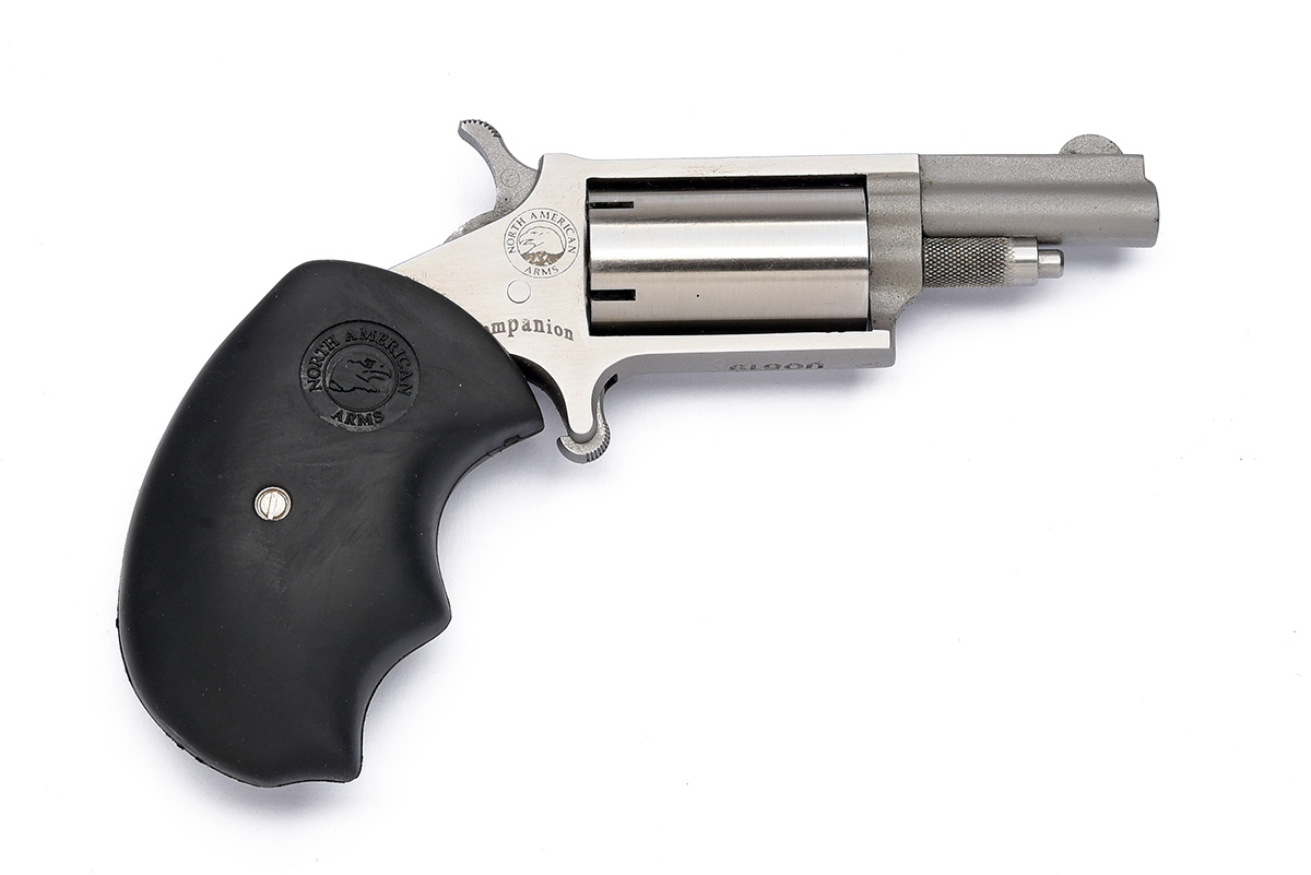 A BOXED MODERN .22 PERCUSSION NORTH AMERICAN ARMS POCKET REVOLVER, serial no. U0519, with round stainless1 1/2in. barrel, solid frame with plain five-shot cylinder, soft rubber oversized grip, appearing little used in its makers card carton with zip-up pouch , loading tools and sundry accessories