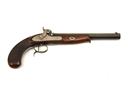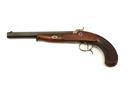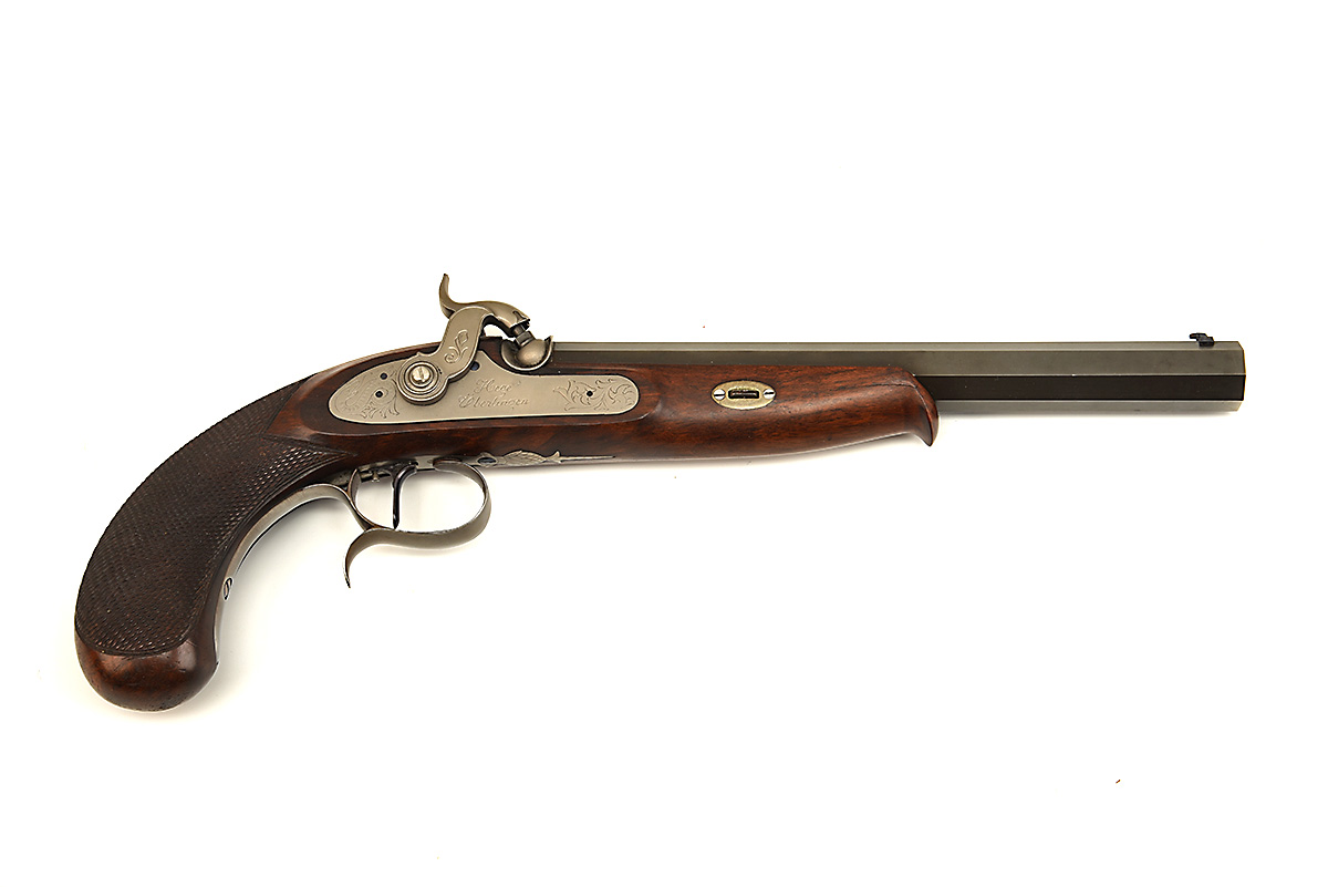 A CASED REPRODUCTION HEGE .33 PERCUSSION PISTOL, MODEL 'SIBER A LAUSANNE', serial no. 4236, for 1997, with blacked octagonal 9 1/2in. rifled barrel, brushed bright breech and lock (extreme tip of hammer-spur lacking), walnut half-stock with chequered bag-shaped grip (old splits and repairs to fore-end) and single set trigger, in an aluminium travel-case with a host of cleaning and loading accessories