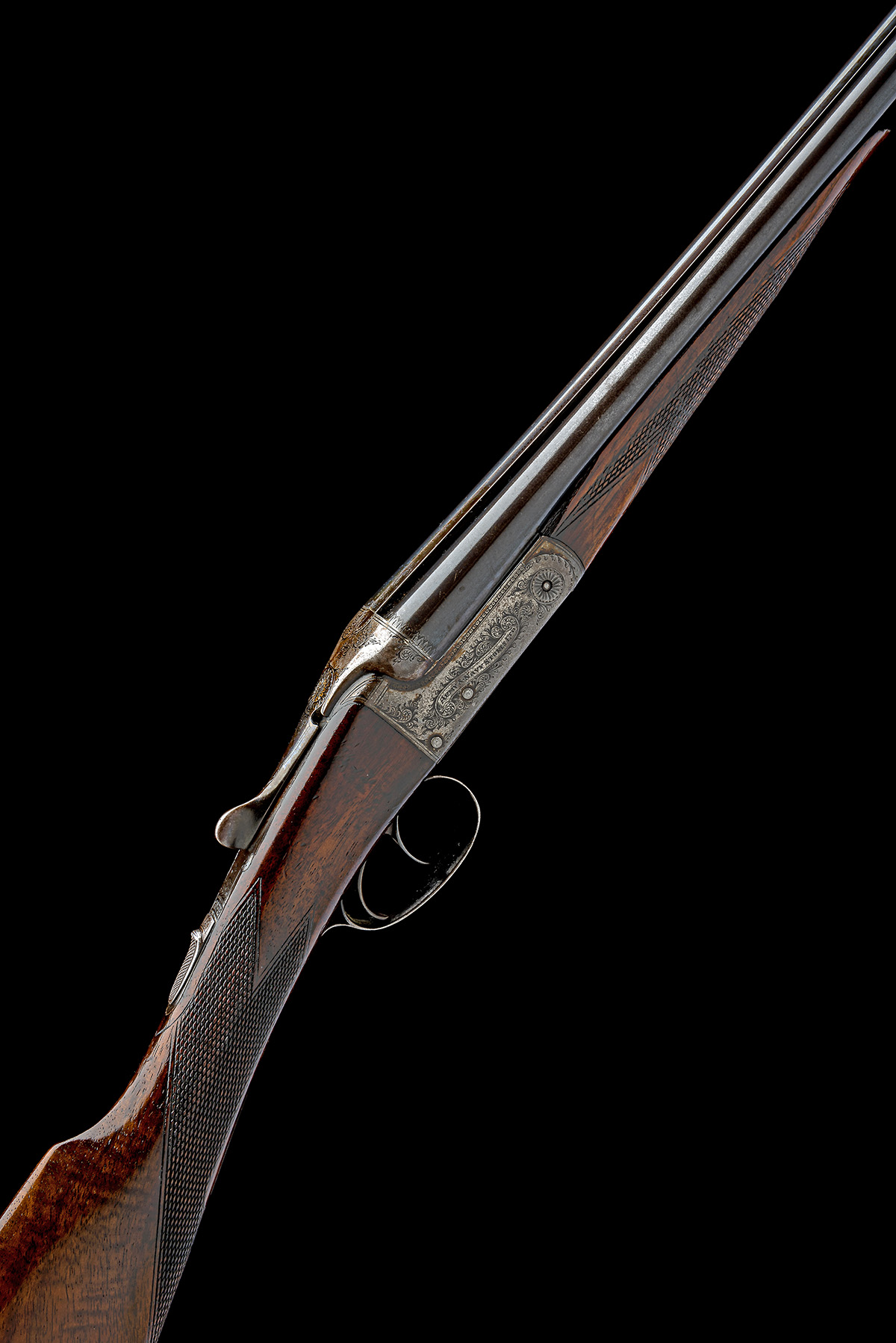 for 1935, 26in. nitro barrels, the rib engraved 'ARMY & NAVY STORES LTD. LONDON.', and with acanthus scroll detailing at the breech end, 2 1/2in. chambers, bored approx. 1/2 and full choke, automatic safety with engraved 'SAFE' detail, border and partial acanthus scroll engraving, the makers name in a scrolling banner, retaining very slight traces of colour-hardening and finish, 14 1/4in. figured stock, Hackett-type snap-on fore-end, weight 4lb. 6oz.