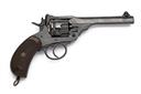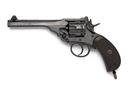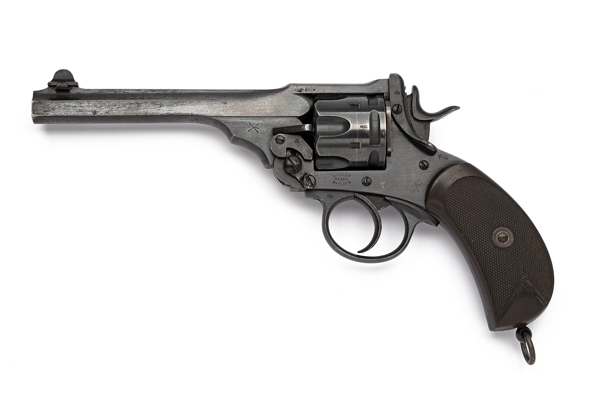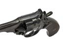 circa 1914, with blued 6in. barrel, dove-tailed fore-sight, fixed rear-sight to the stirrup locking-latch, break-open frame with auto-ejecting fluted cylinder, blacked ancillaries, double-action mechanism and chequered hard rubber birdshead grips, much original finish remaining throughout