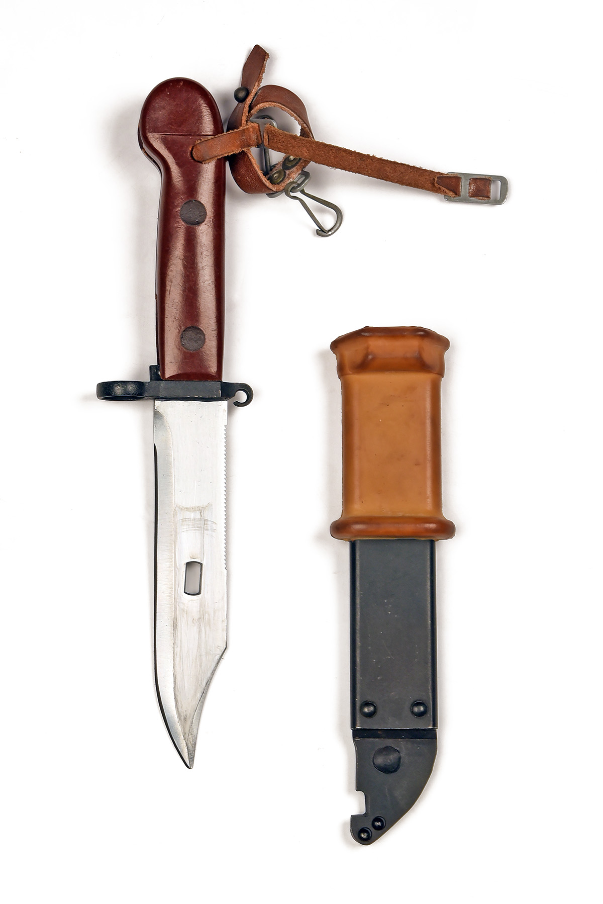 AN EASTERN BLOCK AKM TYPE I BAYONET, 1960s, with 6 in. double-edged clipped point blade, one-piece moulded handle, scabbard body with lug allowing conversion into a wire-cutter, complete with rubber insulator grip to allow electrified wire to be safely cut plus belt strapping, 13 in. overall