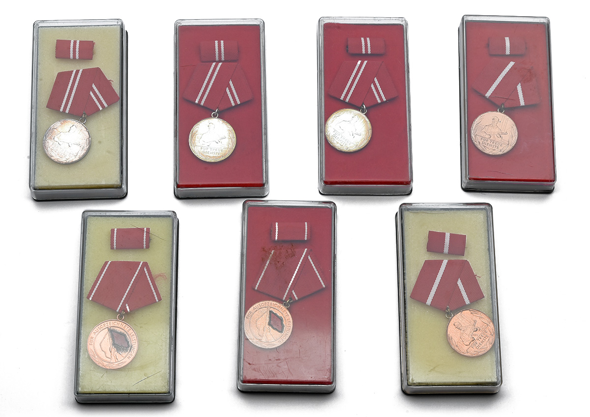 A GROUP OF SEVEN EAST GERMAN MEDALS IN BOXES OF ISSUE, being; x2 Medal for Excellent Performance in the Fighting Groups of the Working Class; x5 Medal for Faithful Service in Fighting Groups of the Working Class, x2 for 5 years' service (bronze) and x3 for 10 years' service (silver)