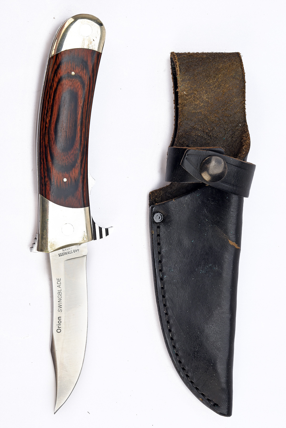 A RARE LIMITED EDITION ORION SWING KNIFE MOD SB-2 TOGETHER WITH A VINTAGE CAMILLUS MODEL 26 FOLDING KNIFE, the first number 98 of an edition 0f 200, with rotating 4in. blade changing from sporting to filleting, appearing little used in its makers carton with papers (carton worn), the second with dual non-locking 4in blades and stag scales, used in a leather belt-pouch (2)
