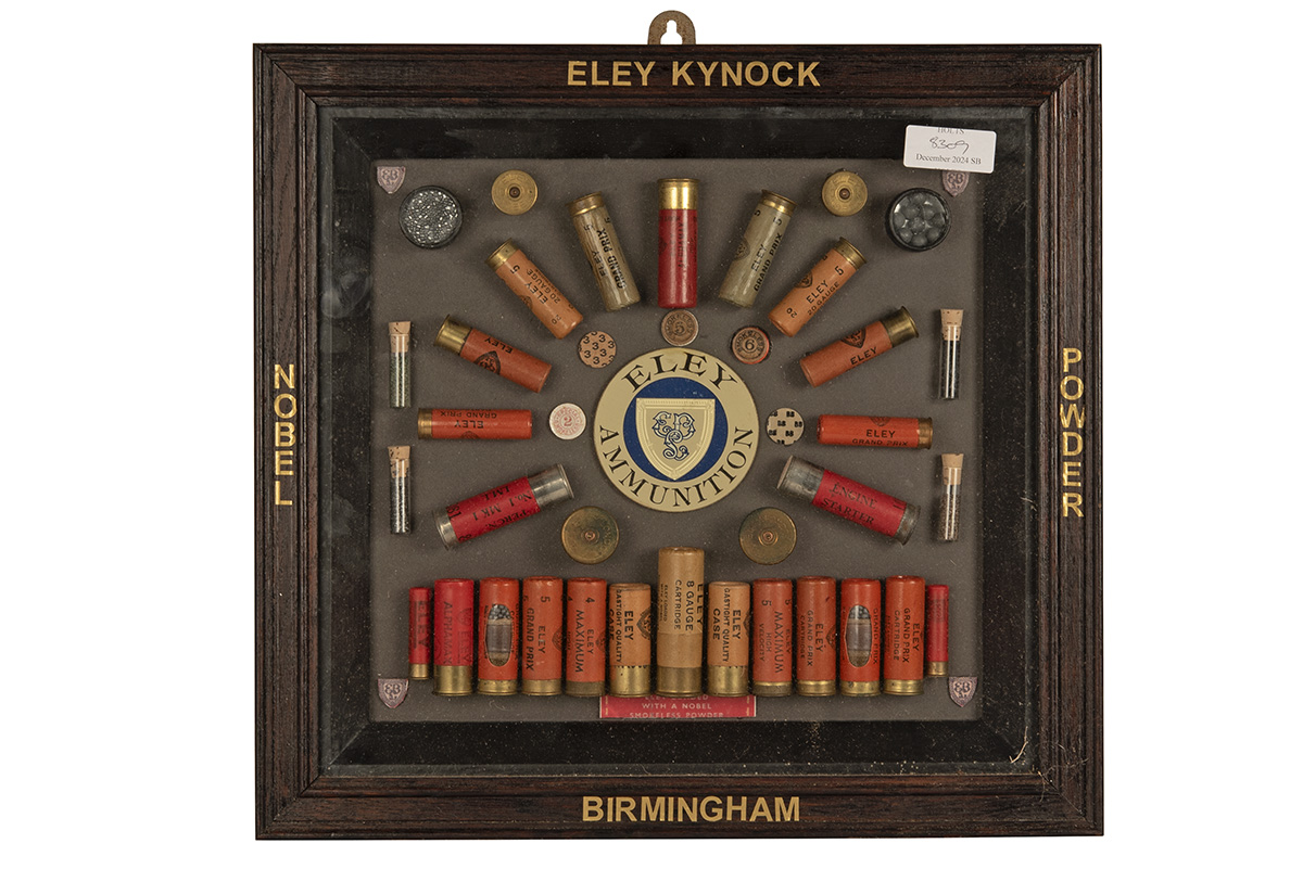 A SHOT CARTRIDGE DISPLAY BOARD, displaying Eley papercase shot cartridges of various calibres, with shot and powder, framed and glazed in a wooden frame marked 'ELEY KYNOCH NOBEL POWDER BIRMINGHAM, set of a grey board with a central 'ELEY AMMUNITION' trade label