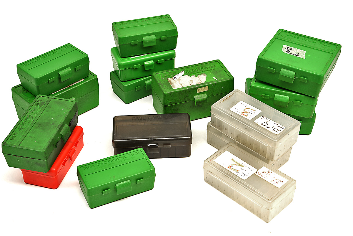 EIGHTEEN ASSORTED MTM CASE-GARD AMMUNITION BOXES, (18)