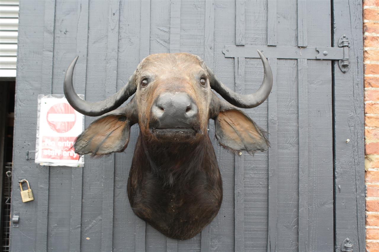 A CAPE AND HEAD MOUNT OF A BUFFALO
