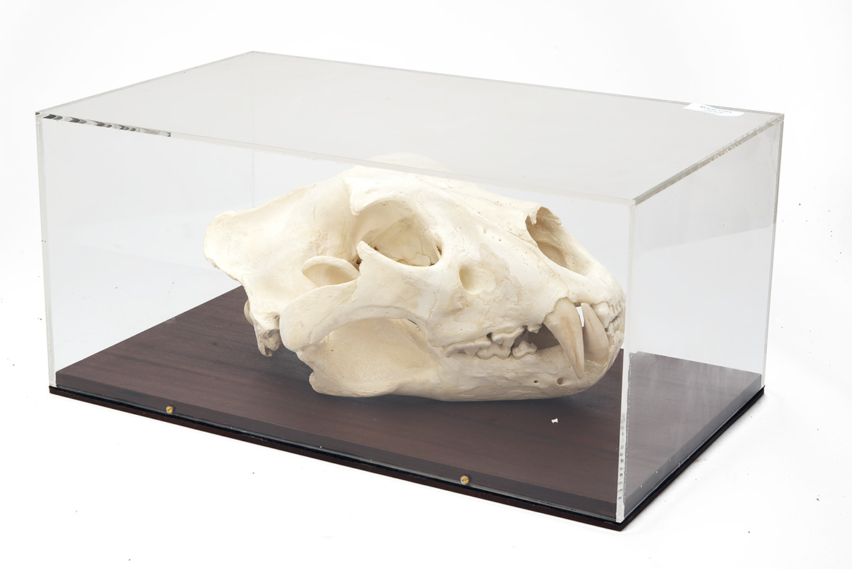 A SKULL MOUNT OF A CASED AFRICAN LION, case measuring approx. 19in. x 12in. x 10in.