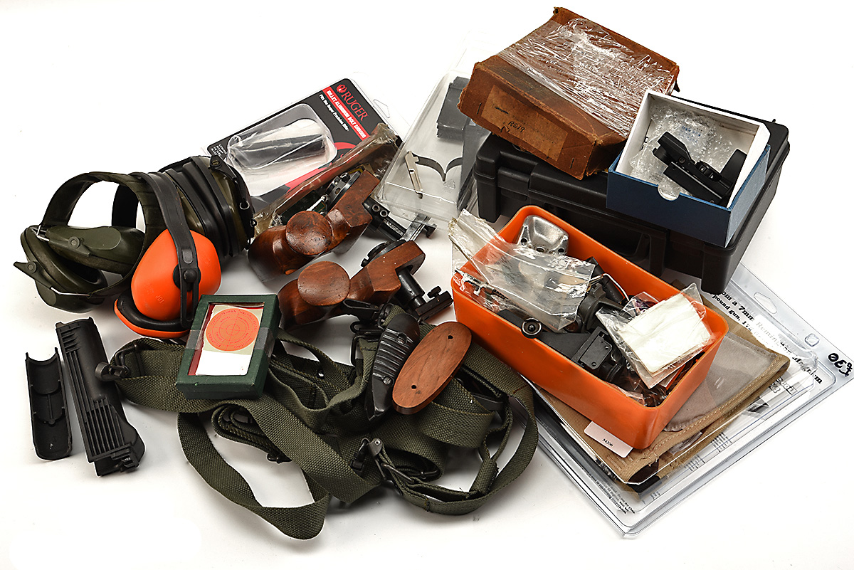 'HOWARD LEIGHT' electronic ear defenders, 'DEBEN' & 'SUPERLITE' slim passive protection, 'SPOTON' laser bore sight, 'FOX' 1x2x33 electro dot sight (untested), THREE 3 point canvas rifle slings, 'REM 700' magazine and trigger guard, butt plates, 'PAST' recoil pad, 'RUGER' billet bolt shroud, rifle cleaning kit, workzone box, various target rifle parts and equipment as well as other related sundries