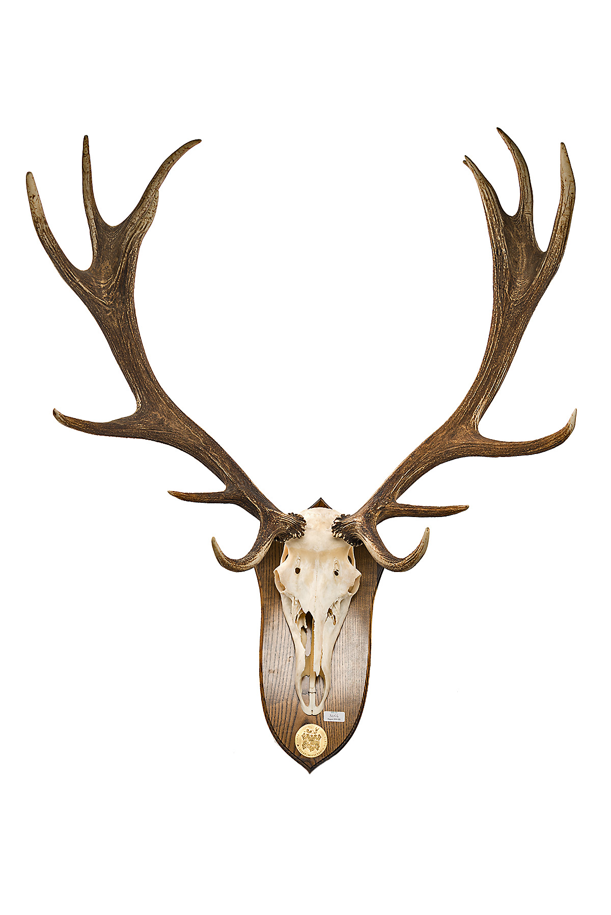 A SKULL MOUNT OF A FOURTEEN POINT STAG, mounted on a wooden plaque
