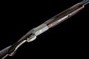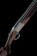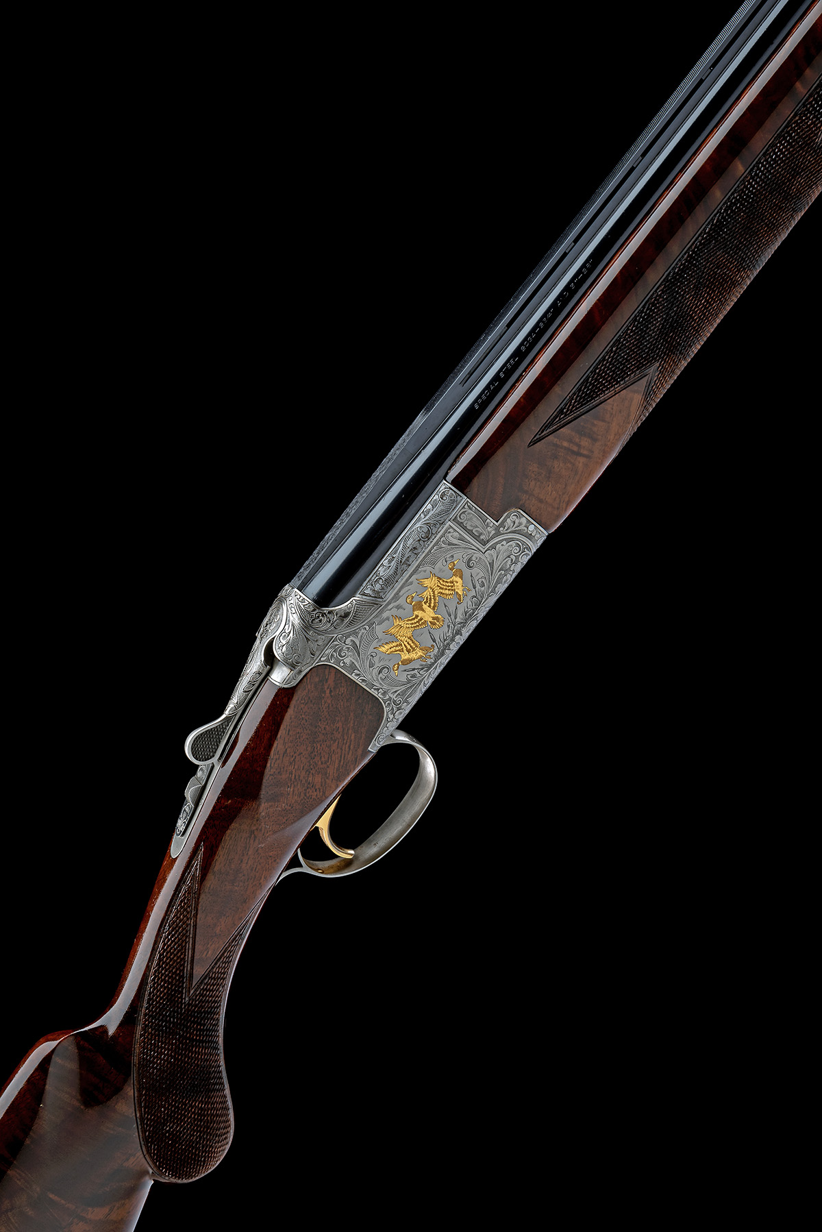 for 1990, 28in. nitro reproved barrels (in 2024), with 6mm ventilated matt rib, 3in. chambers, multichoke (no spares), hold-open toplever, manual safety with integral barrel-selector switch, gold-washed trigger, the action and furniture engraved with bold acanthus scrollwork on a matt background, surrounding gold-inlaid game scenes of pheasant and duck, the underside with a setter, the triggerguard with a partridge, 14 1/4in. figured semi-pistolgrip stock including buttplate, weight 6lb. 14oz., in its makers faux-fur lined case