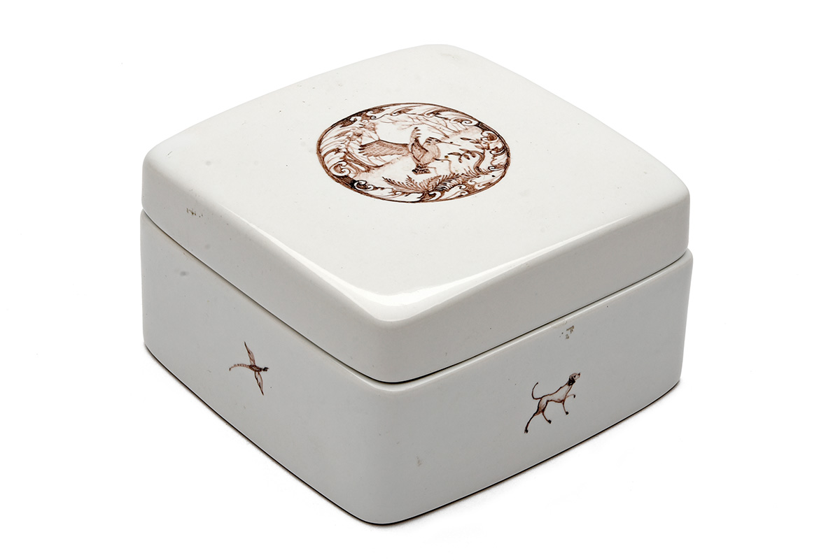 A JAMES PURDEY & SONS ENGLISH DELFTWARE HAND PAINTED TRINKET BOX,