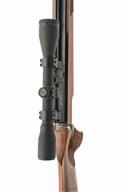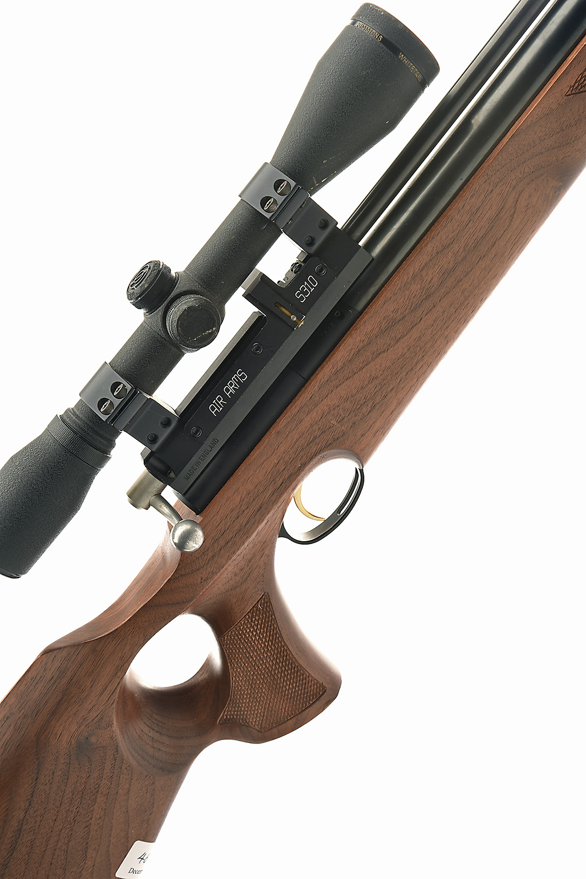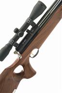 AN FAC-RATED .22 AIR ARMS S310 WALNUT THUMB-HOLE PRE-CHARGED PNEUMATIC AIR-RIFLE, serial no. 1846, with 26in. barrel including built-on sound-moderator (moderator damaged), bolt action receiver with magazine,, walnut thumb-hole right handed three-quarter stock, tested, fitted with a Simmons 4x40 telescopic sight