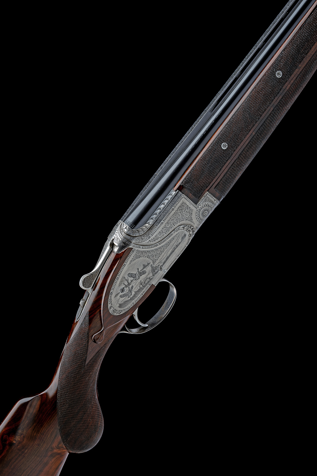 for 1965, 30in. nitro barrels with 7mm ventilated matt top-rib, 2 3/4in. chambers, bored approx. 1/4 and 3/4 choke, three-piece fore-end, hold-open toplever, automatic safety with integral barrel selector switch, gold-inlaid with 'O', 'U' and 'S' details, fine acanthus scroll engraving with beaded bordering and finely engraved game scenes of pheasant and English partridge, the underside with a bolting hare, the triggerplate signed 'GIRONI', bright finish, 14 5/8in. highly-figured pistolgrip stock (cast on for the left shoulder), weight 7lb. 14oz., in a Browning universal case